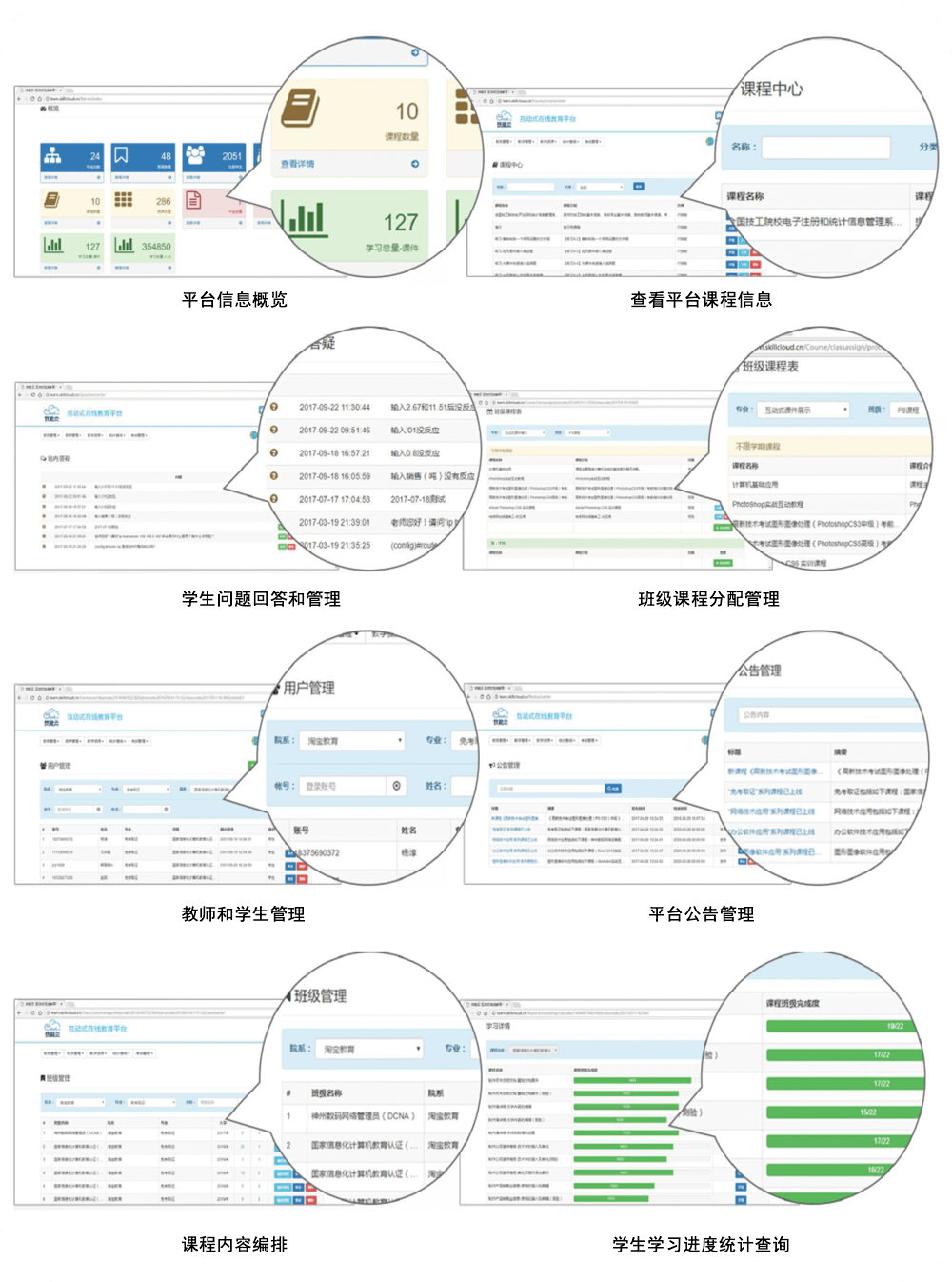 包括教务管理、教学管理、在线培训、资源课程管理、站内答疑、新闻公告、作业管理、统计分析等模块
