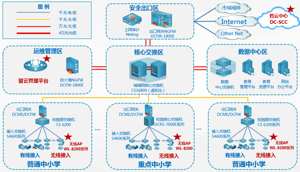 z6com尊龙官网 根据普教用户无线网络管理和使用现状,以及对业务应用系统分析,遵从“云网融合 易网无忧”的新主张,对原有有线城域网采用了“云 ‧ 平台”二级智云部署架构,搭建了简单易用的综合智云管理平台,部署了无线网络。既实现了“人 ‧ 网络”的深度管理融合,也为云业务的召开打下良好的基础!总拓扑结构图如下: