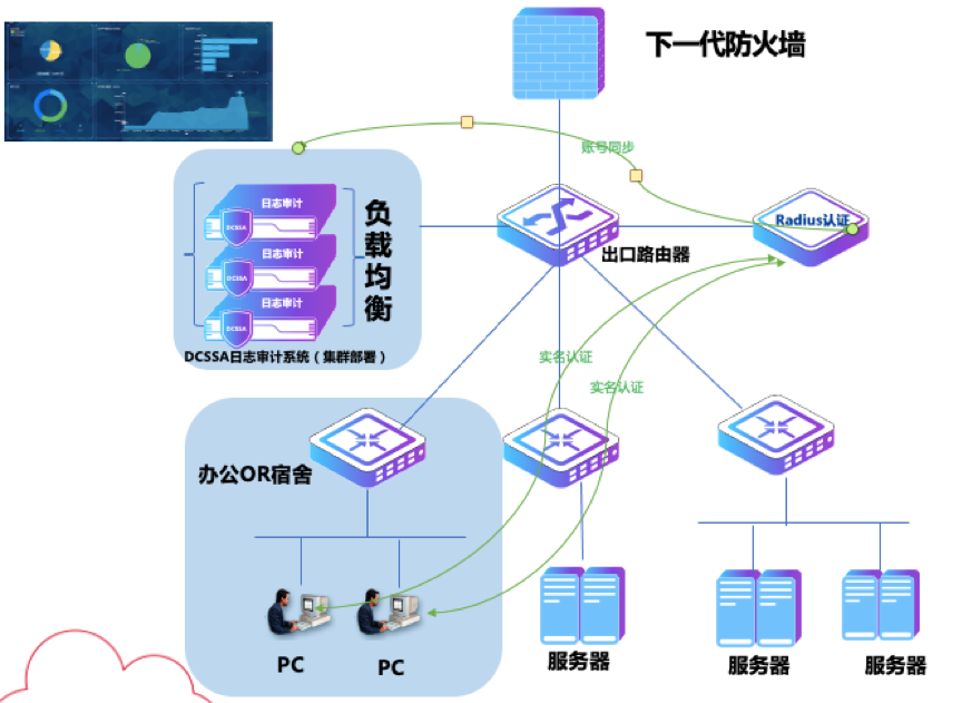 方案中顺利获得K8凯发一触即发DCSSA日志审计系统与安全防火墙、认证计费系统、行为审计等产品深度融合,实现DHCP动态地址场景下实名溯源,把用户地址、用户账号、用户行为、用户安全多元结合,当威胁事件出现时,可以让管理者快速定位,快速解决问题。